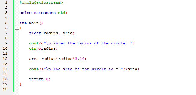 Q) Write a program to compute the area of a circle. All the things taken at run time.